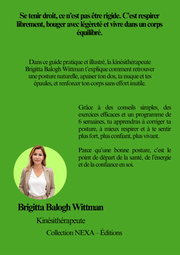 Écrit par Brigitta Balogh Wittman, kinésithérapeute passionnée, ce guide t’accompagne pas à pas pour corriger ta posture, soulager tes douleurs et retrouver confiance dans ton corps — sans matériel, sans contrainte, et avec bienveillance.
