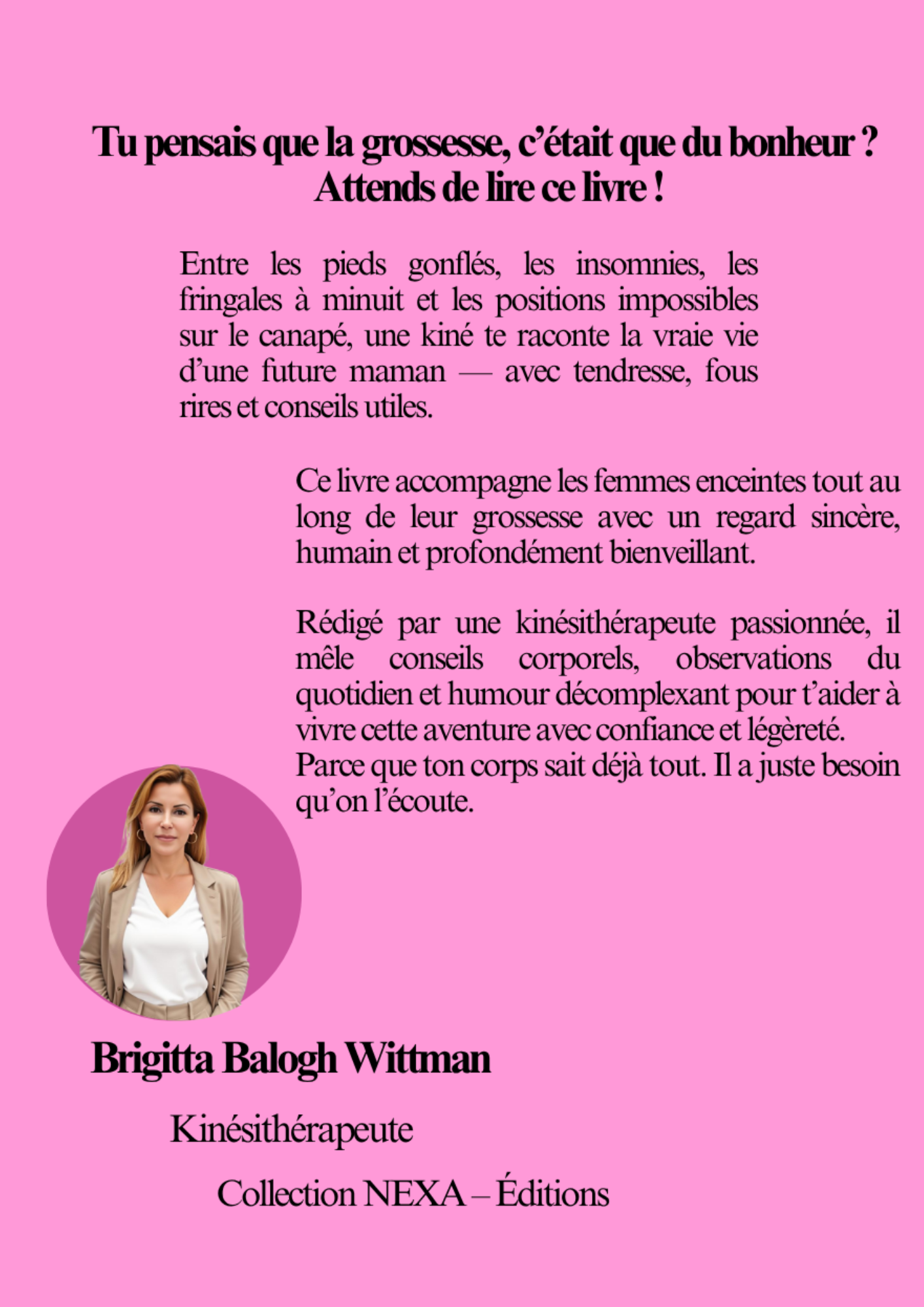 Rédigé par une kinésithérapeute passionnée, il mêle conseils corporels, observations du quotidien et humour décomplexant pour t’aider à vivre cette aventure avec confiance et légèreté.