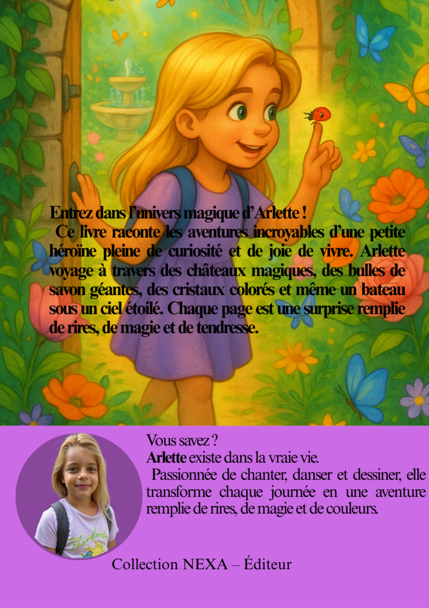 Ce livre raconte les aventures incroyables d’une petite héroïne pleine de curiosité et de joie de vivre. Arlette voyage à travers des châteaux magiques, des bulles de savon géantes, des cristaux colorés et même un bateau sous un ciel étoilé. Chaque page est une surprise remplie de rires, de magie et de tendresse.